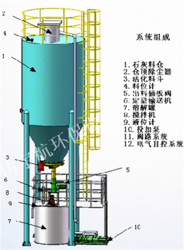 石灰料倉、倉頂除塵器、活化料斗、料位計、出料插板閥、螺旋輸送機、溶解罐、攪拌機、磁翻板液位計、螺桿泵、管路系統、電器自控系統。